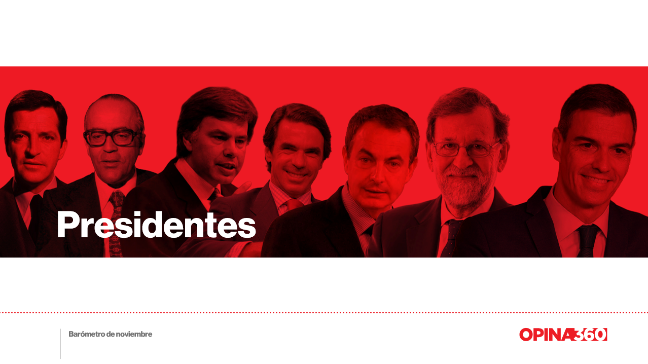 Adolfo Suárez es el presidente mejor valorado de la democracia al obtener una nota media de 7,2. Así lo reflejan los datos de la encuesta de noviembre de Opina 360, que ha preguntado a los españoles por la valoración de todos los presidentes del Gobierno desde la transición.